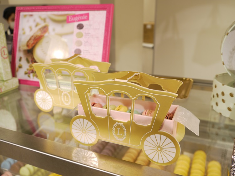 ラデュレは、そのパッケージやショッパーにも並々ならぬこだわりがあるのも人気の要因の一つなのですが、今回、日本ではここ博多でしか購入できない、ゴールドの”キャロス型”が登場!限定48個という希少な商品なので、あっという間に売り切れてしまうかも。欲しい方は急いで来店を!中の箱には、好きなマカロンを6個入れることができますよ♪