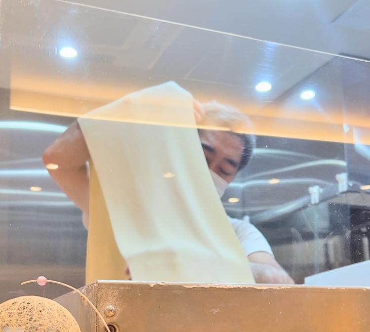 目の前で、うどんを作っている貴重な様子も見ることができました。店内はカウンターとテーブル席が3~4つありました。長年続いているお店ですが、実は4年前に移転し店内は新しくなっているそうです。狭くはない店内ですが、平日にも関わらず大行列ができておりました。