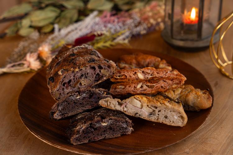 甘酸っぱく漬け込んだクランベリーとホワイトチョコをカカオ生地に練り込んだスペシャル・リュスティック。外側はガリガリッと、中身はしっとり&モチッとした食感がたまりません。