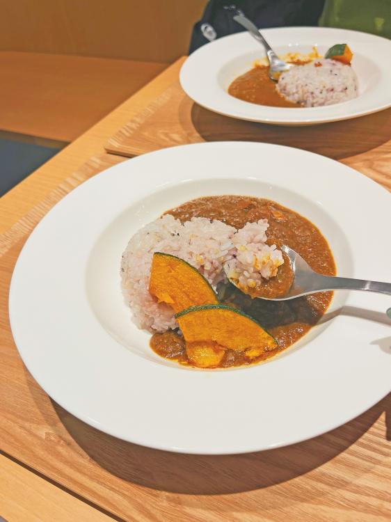 今日のお昼はカレー♪辛口でもルーに10種類の野菜がたっぷり溶け込んでいるので、とっても食べやすい。美味しいのに100キロカロリー以下なのがほんとうにびっくりです。