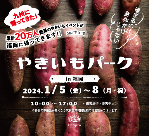 1月5〜8日の4日間、福岡市西区「マリノアシティ福岡」で全国各地のさまざまな“さつまいも”が集まる話題のイベント『やきいもパークin福岡』が開催されます。
