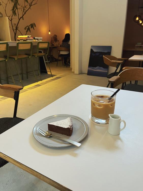 やさしいアイスオレに、ねっとり濃厚なチョコレートケーキ。コーヒー豆は、京都の自家焙煎珈琲ガロさんで焙煎、ハンドピックされたものを使用しているそう。