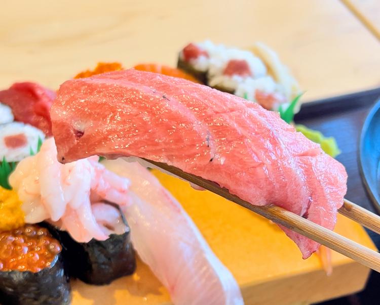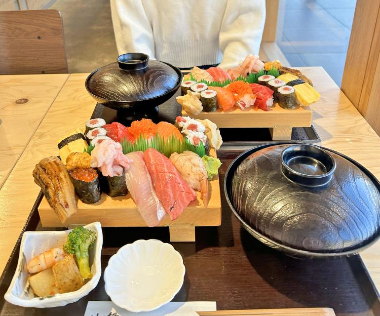 あら汁と小鉢がセットで、2980円!お寿司のネタも大きく、本マグロ中トロ、赤身、ウニ、イクラ、車えび、カンパチなどなど、12種類のお寿司を楽しめます。お店で捌いた新鮮な海鮮を使っているので新鮮で美味しいです。