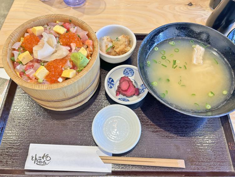 本日ご紹介するのは、SNSでもバズっている、宗像の『Tonkoya FISH MARKET』。開店前からお客さんが集まるここのお店。狙いはみなさん、この限定の『とんこや日本一特製寿司盛』!