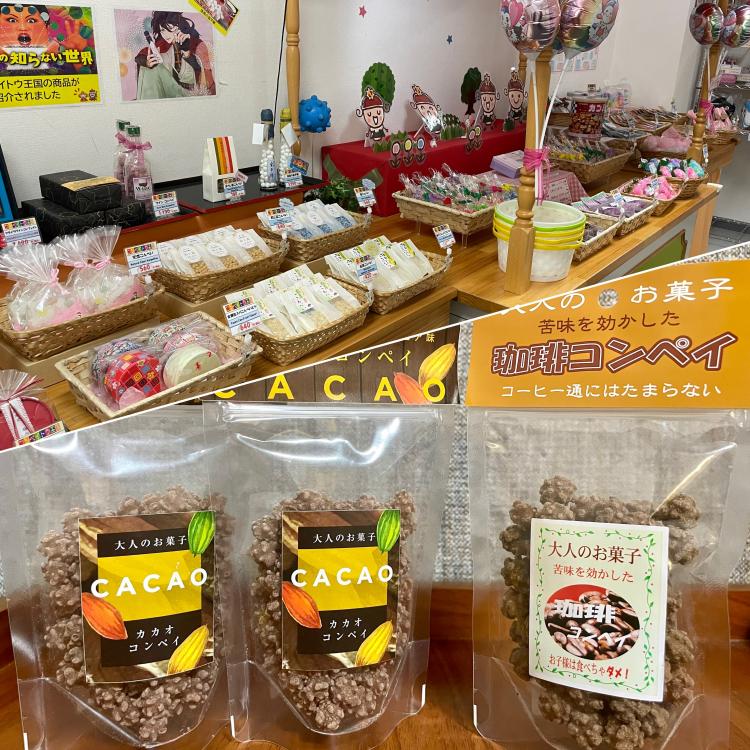 『コンペイトウ王国』では、いろんな味のコンペイトウも販売しています。人気NO.1の「珈琲コンペイ」(480円)や甘さ控えめの「カカオコンペイ」(450円)は大人に大人気!おみやげにいかが?