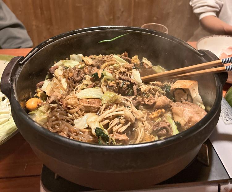 続いては、、長ネギやキャベツ、エノキ、豆腐などの野菜類を加え、さらにぐつぐつと鍋を煮立たせます。鶏の旨味が染み込んだ野菜たっぷりのすき焼きも、これも言うまでもなく絶品でした。地鶏の刺身やかしわにぎりに締めのうどんまで、ボリュームも満点のコースメニュー。