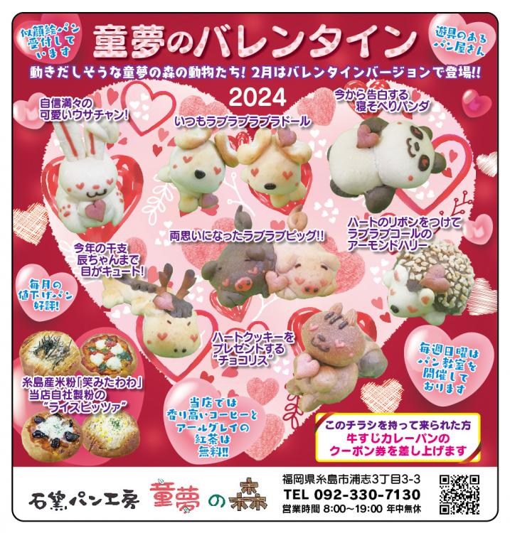 糸島市にある『石窯パン工房 童夢の森』では、2月14日(水)バレンタインデーまで動物の形をした、今にも動き出しそうな立体パン「童夢の森の動物」たちが、バレンタインバージョンで登場!