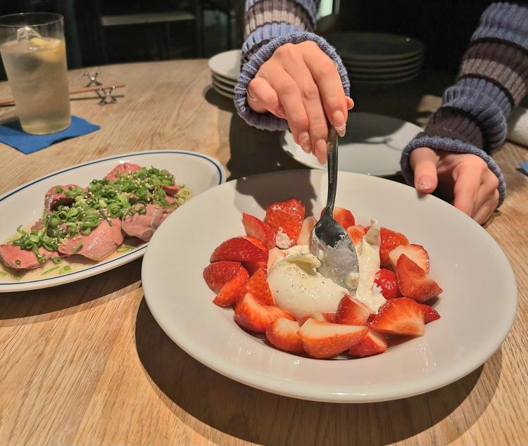 『あまおうと恋みのりのブラータチーズ』は 2種類の苺がたくさん入ったカプレーゼ。季節のフルーツを使ったカプレーゼは、シーズン問わずとても人気のメニューだとか。わたしが行った時は苺でした。可愛すぎて、ときめきが止まりません...。
