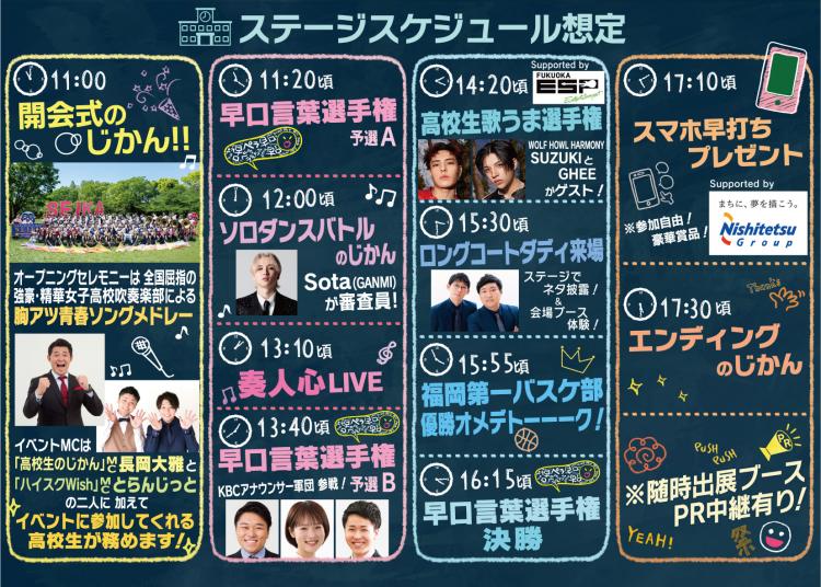 当日はお笑い芸人や有名人のスペシャルゲストもあり!しかも入場は完全無料! 出入自由のオープン型イベントになっているので、高校生はもちろんのこと、知人・友人・保護者のみなさん、さらには昔高校生だった大人のみなさんもぜひ福岡・佐賀の高校生が放つ「青春(アオハル)の輝き」を目撃しに行こう。
