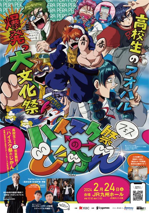 今回のイベント『ハイスク祭(フェス)のじかん』のメインビジュアルを作画したのはKBCマンガイラスト選手権でグランプリの輝いた九州産業大学付属九州産業高校1年生の小倉望さん。すべてが高校生の、高校生による、高校生のための「青春」集大成イベントになっている!