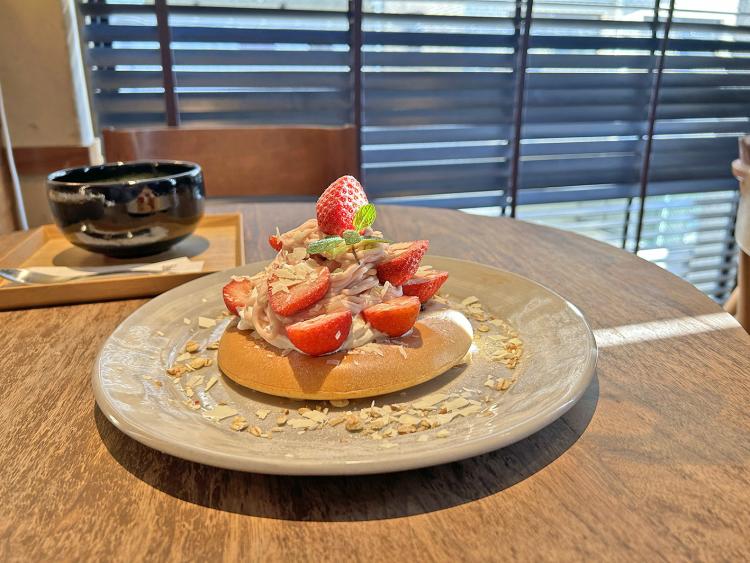 こちらはリニューアルオープンして新しくできた『四季のパンケーキあまおう苺』。季節限定で、GWくらいまで提供される予定とのことです。あまおう苺をふんだんに使った、白あんとマスカルポーネのモンブランパンケーキ。さらに、中から苺のジェラートも出てきて、苺好きにはたまらない大満足のパンケーキでした。