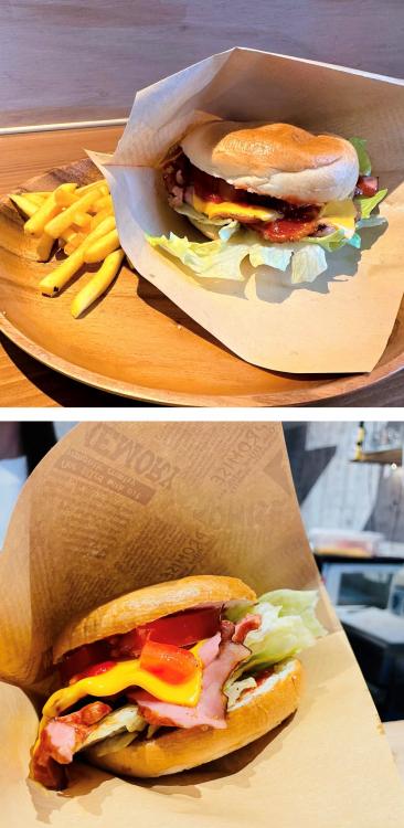 ベーグルサンドは基本のプレーンを使い、大きく分けて総菜系とスイーツ系の2種類があります。総菜系は食べ応え抜群の「ハムチーズトマトサンド」(750円)とジューシーな「タルタルチキンサンド」(850円)、衣がザクザクで肉の食感がふわふわの「メンチカツサンド」(850円)の3つのサンド。ドリンクとポテトがついたセットメニュー(1350円)もあります。