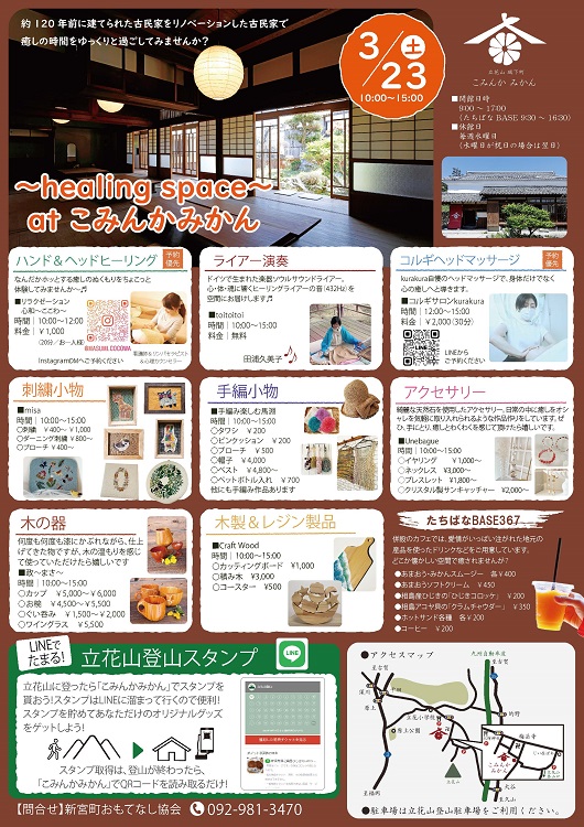 築約120年の古民家をリノベーションした観光交流拠点施設『こみんかみかん』で、『~healing space~atこみんかみかん』が初開催されます。