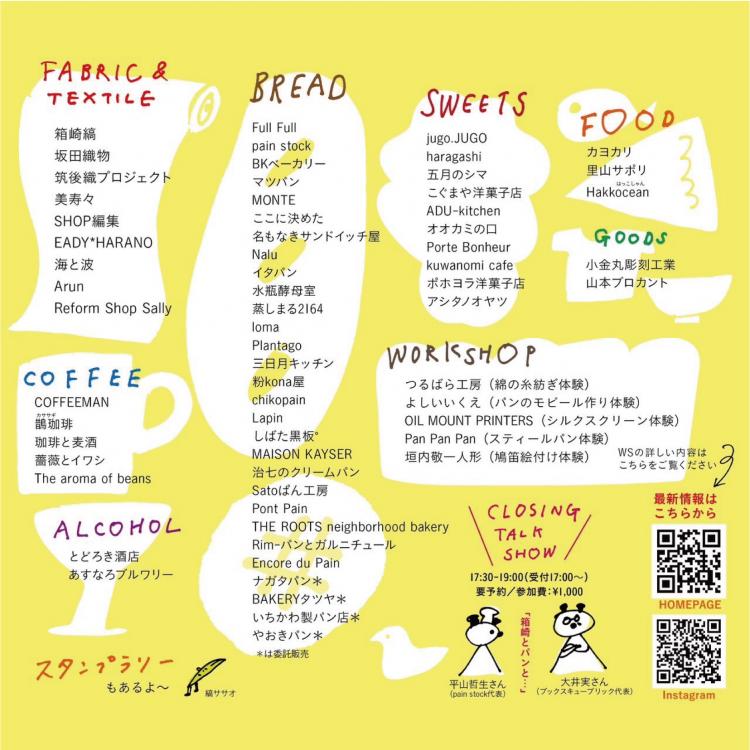 パン以外にもコーヒーやジャム、ローカルフードの飲食ブースや雑貨などの物販ブースも多数出店。さらには織物や布のブースには、箱崎縞はもちろん、久留米絣、博多織、小倉織、筑後織など福岡で生まれた織物のアイテムが大集合。その他にも、パンのモビールづくりやシルクスクリーン印刷などが体験できるワークショップ・ブースもお見逃しなく。