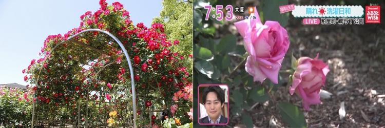 左:バラのトンネル(写真)※粕屋町提供、右: 粕屋町独自のバラの品種「かすやの里」