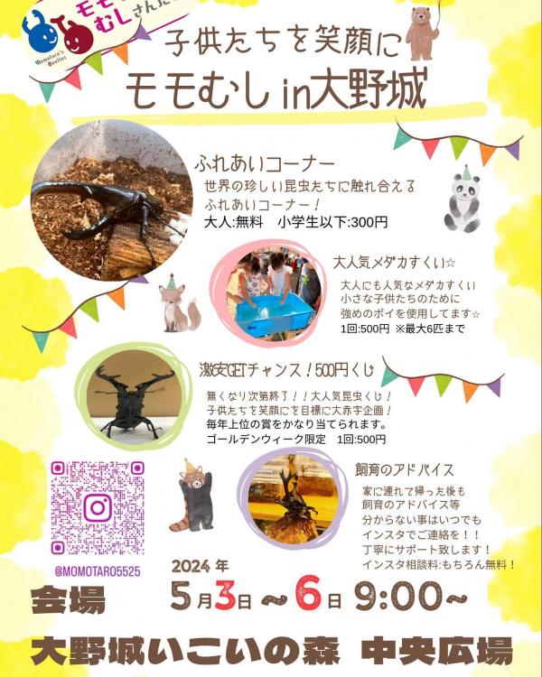 『大野城いこいの森 中央公園』ではGWの5月3日(金)~6日(月)の4日間、昆虫たちとふれあうイベント『子供たちを笑顔に モモむし㏌大野城』を行います。