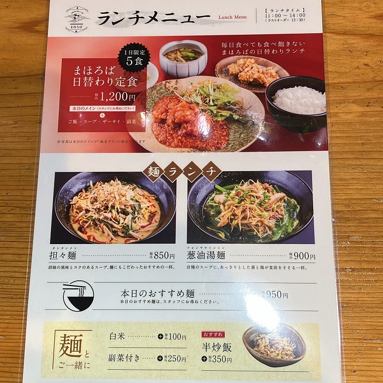 ランチの『まほろば日替わり定食』(1200円)は、開店すぐになくなる日も多い人気メニュー。本日のメインにご飯、副菜、スープ、ザーサイが付きます。1日限定5食ですが、前日までに予約をすれば5食以上でも対応可能とのこと。ランチは他に、あっさりとしたネギと鶏が食欲をそそる『葱油湯麺(ツォンヤウトンミン)』(900円)、日替わりの『本日のおすすめ麺(飯)』(950円)。早めにすべて売り切れてしまう日もあるそうなので、予約が確実です。