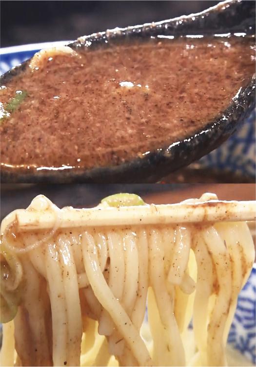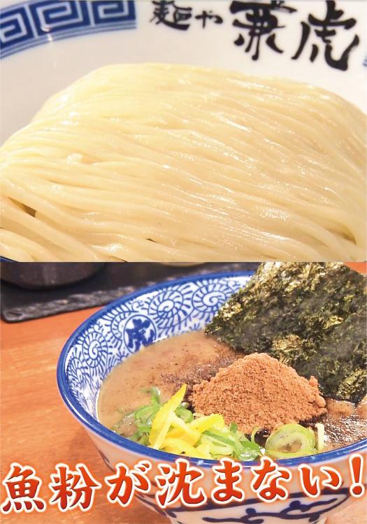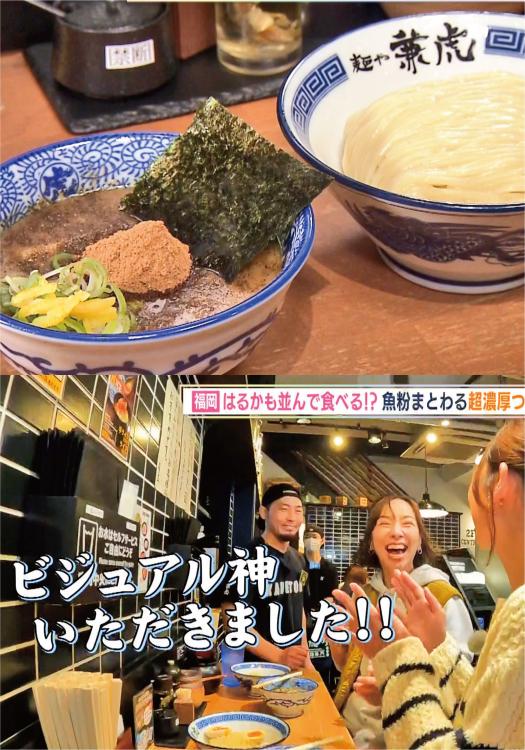 すべて出揃ったところで「もうすでにビジュアルが神ってる!」とはるちゃんのコメントに店員さんも「ビジュアル神いただきました!」と大喜び。食べる際はカツオの魚粉をスープと混ぜ混ぜしながらいただくのがここの流儀。スープは豚骨・鶏ガラ・香味野菜などを7時間煮続けたものにサバ節のダシを合わせているそうです。