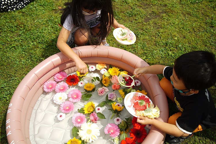 水を張ったプールに花を浮かべてすくう「お花すくい体験」(無料)は、かわいくて子どもたちに大人気!すくった花は一輪持ち帰ることができます。