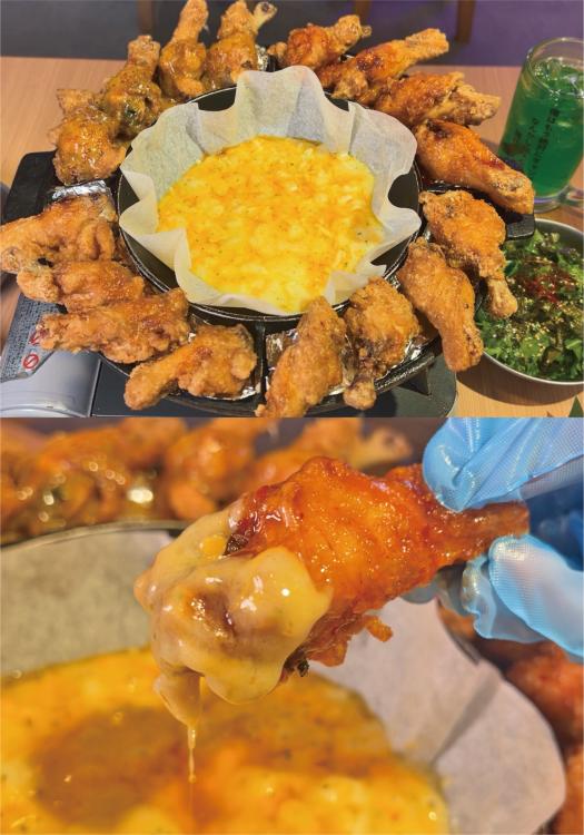 コチラはインタビューでもたくさんコメントが寄せられていた大人気のメイン料理の一つ『チョアチキン』!4つの味から選ぶことがでます。写真は『ヤンニョム』。とろ~りチーズをたっぷりと付けていただきます。