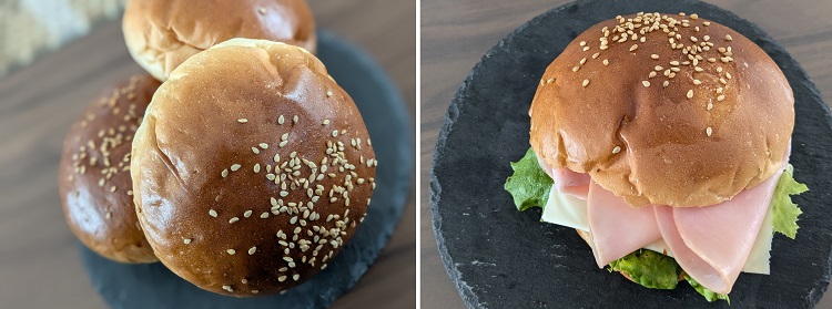 カフェやハンバーガー店とまったく同じものではないですが、店頭でもバンズを買うことができます(3個270円)。筆者も自宅でサンドイッチにしてみました(ハンバーグがなかったのでハムとチーズで、、、)。少しリベイクしたバンズは表面がカリッとしていて、中はフワッフワ!ちょっと贅沢な気分になれますし、お手頃価格なのも推しポイントです‼