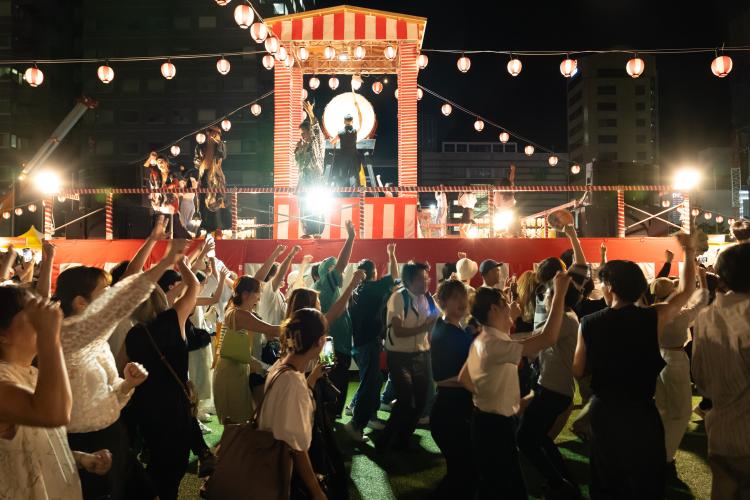祭りと言えば「盆踊り」。広場の中央には“やぐら”が建てられ、自由に参加できる盆踊りの時間もあります。伝統的な炭坑節に加えて、ポップな音楽も流す予定。みんなで輪になって踊る一体感は格別です!
