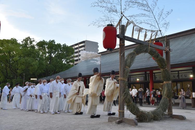 当日、境内では茅(ちがや)で作られた輪をくぐり一年の健康を祈る「茅輪(ちのわ)くぐり」や、人の形をかたどった“形代”に気持ちを込めて息を吹きかけ、罪やけがれを移すと言われる「除災人形(ひとがた)納め」、神職による「千度祓い(せんどばらい)」といった伝統的な神事が行われます。