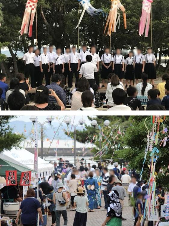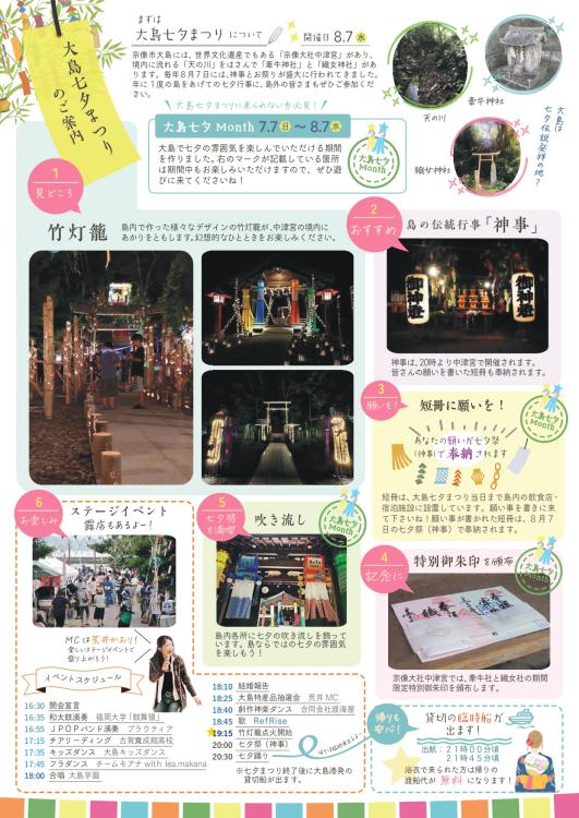 「中津宮」境内下の公園では、地元大島の学校やクラブによるステージイベント(16:30~)や大島の特産品などを販売する出店が立ち並び、七夕まつりを盛り上げます。