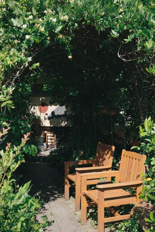 木々がそよそよと揺れ、太陽の光をやさしくしてくれる。お店が緑に覆われているのは、外の世界と離れた空間をつくるためなんだとか。テーブルクロスや暖簾は手作りで、お母さんの想いが至るところから感じられます。