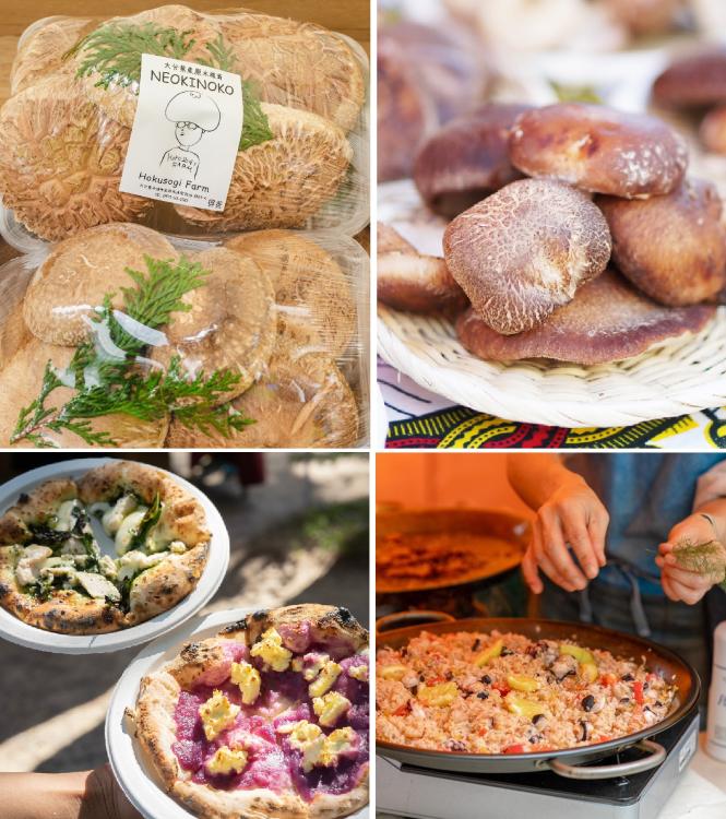 「季節野菜の釜焼きピザ」や「能古島産魚介のパエリア」など、会場で楽しめるフードもオススメです。