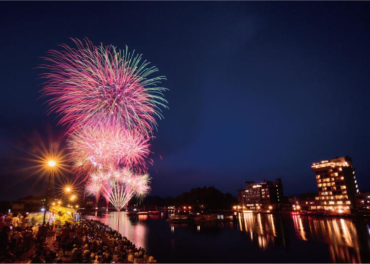 三隈川周辺、日田駅前、中央公園など市内各所に会場を設置。各日のフィナーレを飾るのは、水郷日田に初夏の訪れを告げる花火大会