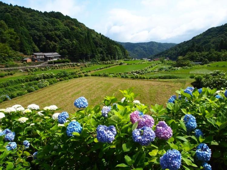 約16000株のアジサイが、田んぼのあぜ道や川沿い約2kmにわたって咲き誇ります。