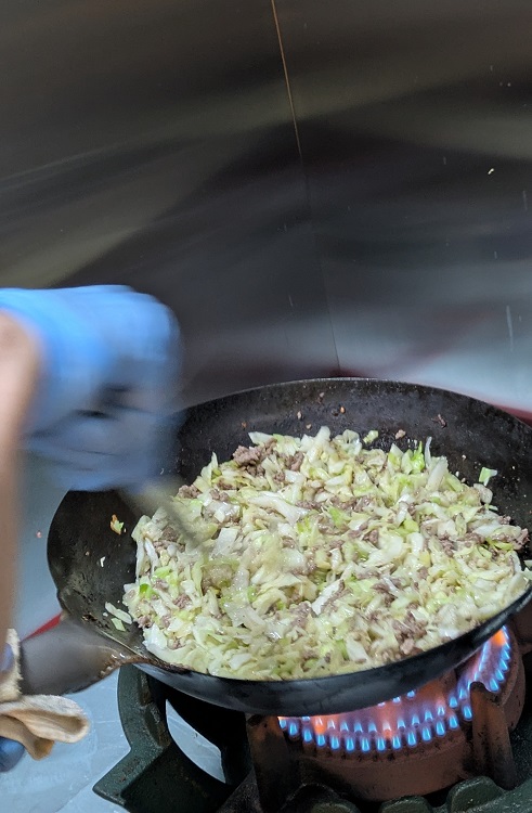 “他にはない味”の決め手は、すべてのバーガーの底にたっぷり仕込まれている肉キャベツ炒め。がっつりニンニクがきいてパンチのある陰の主役です。このキャベツを挟んで最初の焼き、次に具材を挟んで仕上げの焼き。パリパリカリカリの食感と肉肉しいハンバーグ、チーズに卵、そしてキャベツ。この組み合わせが唯一無二の“今屋のハンバーガー”をつくり出しているのです。