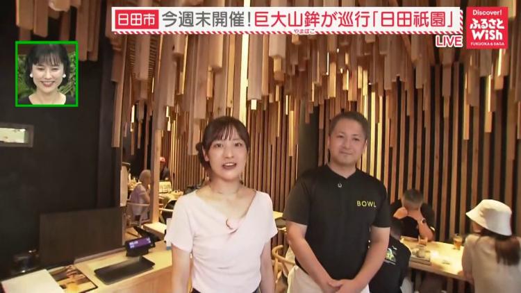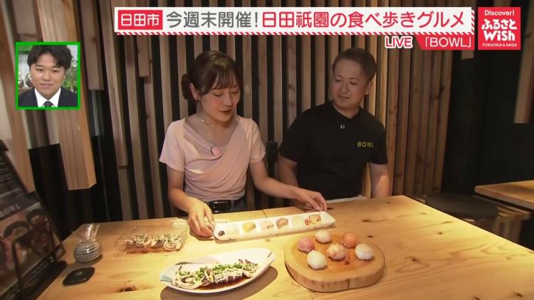 「イカマヨポン」を試食した深川リポーターは「うわ、柔らかい!プリプリしてますよ!めちゃくちゃ美味しい!」と、その食べやすさと美味しさに感動。続いて試食したのは「本マグロ」の手まり寿司。深川リポーターは「やわらかい!ご飯とお魚の柔らかさがすごくマッチしてて、美味しいです!」と、笑顔を見せました。また、「日田祇園」開催期間中は「BOWL」が初めて夜も営業するとのこと。お祭りを楽しんだ後も美味しいグルメを堪能できますね。