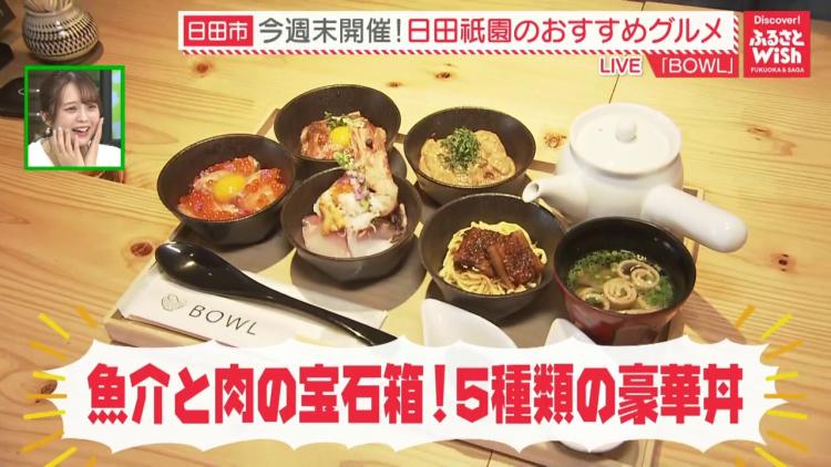 「BOWL」のオーナーである橋本潤也さんに詳しいお話を伺いました。橋本さんは、JR日田駅近くにある、創業36年の日本料理店「季節料理 花門」の2代目オーナーも務めているとのこと。そんな橋本さんが手掛ける「BOWL」のおすすめ料理は 「特選5種BOWL」(2980円)です。そのラインナップは①海鮮丼②国産牛ローストビーフ丼③サーモンいくら丼④国産うなぎ丼⑤鯛の胡麻茶漬け丼(味変用の山芋と、特製お味噌汁付き)という充実ぶり!