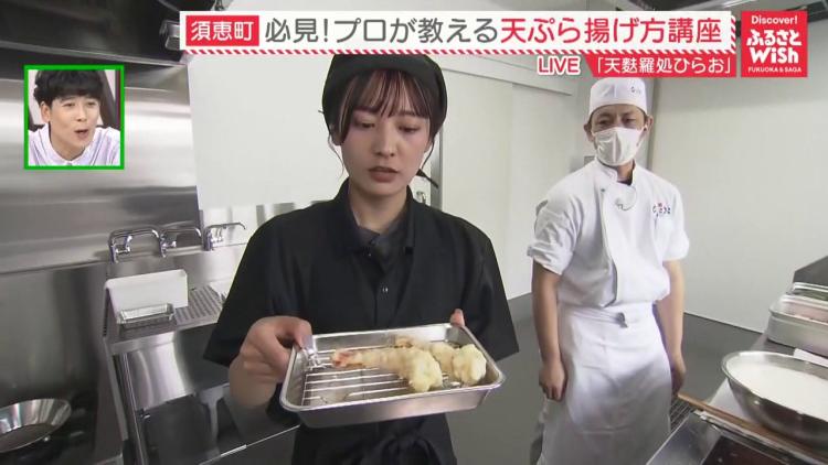 番組の後半では、場所を本社の厨房に移し、プロが教える「天ぷらの揚げ方講座」がスタート! 教えてくれるのは、なんと“エビを揚げ続けて約100万本の男”こと、エリアマネージャーの陣内卓さんです。 天ぷら歴15年の大ベテランから、家庭でも美味しく揚げるコツを学びます。 普段、自宅で天ぷらを揚げることがないという深川リポーター、少し不安そうな表情で挑戦が始まりました。