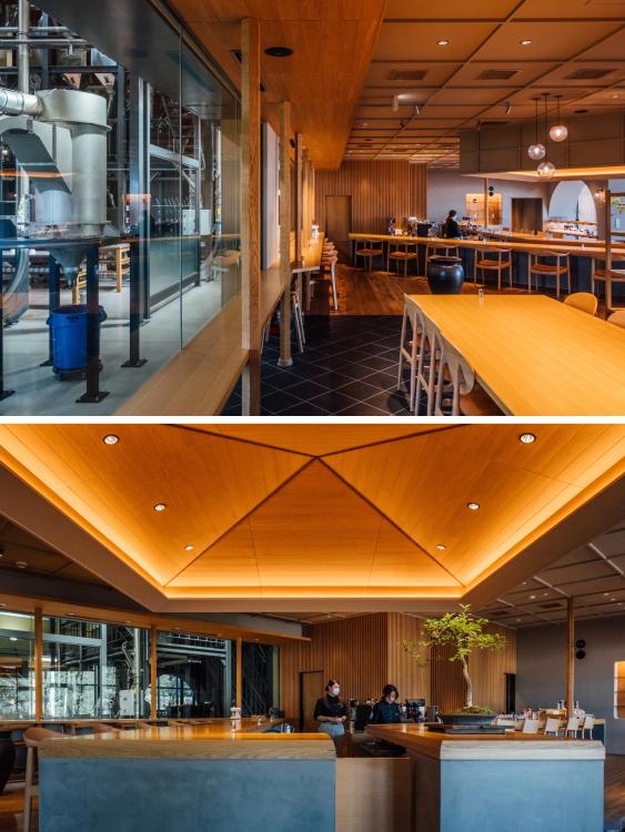カフェ内のインテリアは和風な設えで、一角には日本美術院同人の井手康人画伯の描いた幻想的な『九大の森』の絵画が飾られている。切り出しの石を積んだ店の入口までのアプローチから上野焼のコーヒーカップまで、「日本のスペシャルティコーヒー」というコンセプトが空間全体に反映されている。