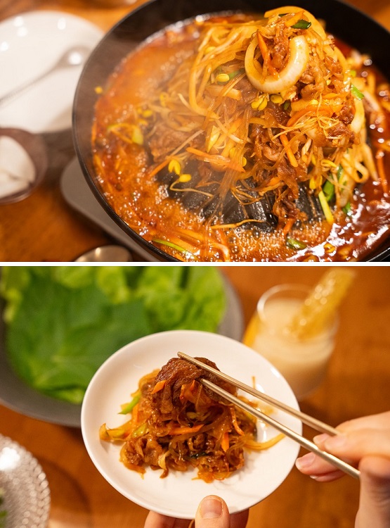 ニンジンやタマネギ、キノコ類にもやし、そしてチャプチェとたっぷりの具材と一緒に炒めたらでき上がり。サンチュ、エゴマの葉に薬味のニンニク、青唐辛子、特製みそだれも付いてきます。おススメは、サンチュとエゴマを重ねてプルコギをのせ、その上にニンニク、青唐辛子を1つずつ、そしてみそだれをちょこっと。ん~さっぱり&コクがあっておいしい!…あ、青唐辛子が後からやってくるので、辛みが苦手な方はお気を付けを。