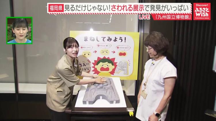 レプリカを触った大久保リポーターは「ほっぺたは結構盛り上がってて…けっこう目は吊り上がってて…眉間にもしわが寄っていて…」と触覚で鬼瓦の表情を読み取った後、鬼瓦の表情を作っていました♪ あなたもぜひ、 真似してみましょう!