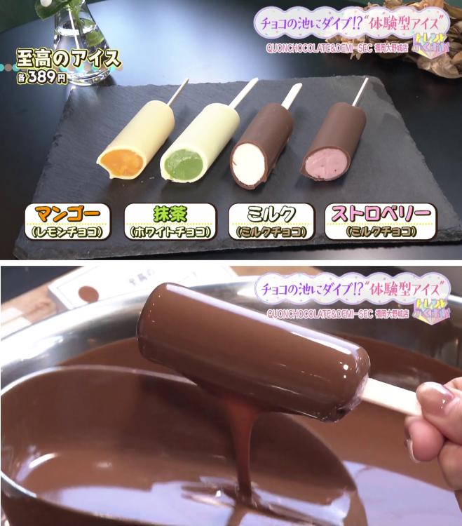 池松リポーターは、ストロベリーアイスをチョイスし、ミルクチョコの池へダイブ!ゆっくりと引き上げると、あっという間に美しいチョコレートコーティングが完成~♪