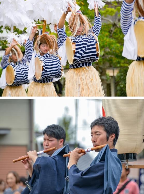 祭りの見どころは、楽方(がくかた)と鉦方(かねかた)による舞楽。楽方は頭にしゃぐま(毛頭)をかぶり、腰にはヘラの蓑、背中に幣竿(へいざお)を立て、胸には締太鼓を抱き、足元は白足袋にわらじという装束。鉦方は頬紅をつけ、赤いたすきに五色のきれを垂らします。雅楽独特のリズムで打ち鳴らす鉦と笛の音に合わせてゆっくりと歌い舞う隊列は、見る者を次第に幽玄の世界へと誘います。