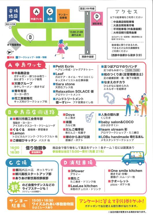 駐車場:中島商店街駐車場/大高合同青果市場/平河駐車場(中島漁協横)/大牟田柳川信用金庫