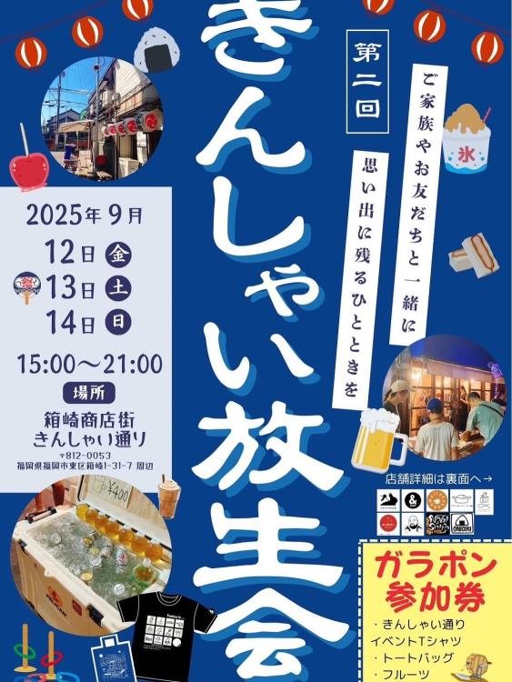 その賑わいに合わせて、今年も箱崎商店街「きんしゃい通り」では、9月12日(金)~14日(日)の3日間、『きんしゃい放生会』が開催されます。