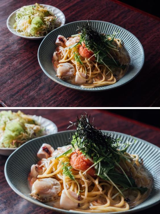 蘭和には多彩なメニューが揃っているが、中でも注目したいのが「エビとホタテとヤリイカのパスタ(たらこクリーム)」(税込1,500円)だ。手作りドレッシングがかかったサラダも付いており、海の幸の旨味とクリーミーなたらこソースが絶妙にマッチしている。特筆すべきは、たらこの量の多さと提供スタイル。パスタの真ん中にたっぷりとたらこが盛られて運ばれてきて、自分で絡めながらいただくスタイルが楽しい。たらこの濃厚な味わいを自分好みに調整できるのも嬉しいポイントだ。