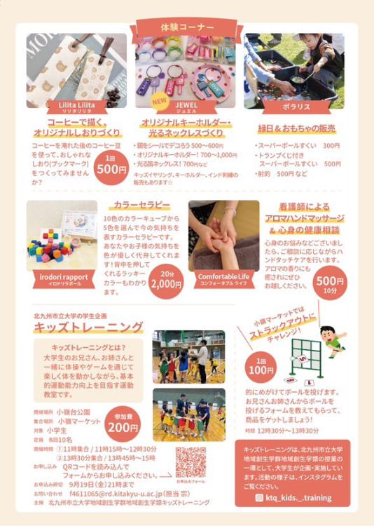 さらに、北九州市立大学の学生によるキッズトレーニング企画が登場!大学生のおにいさん、おねえさんと一緒に体を動かしながら、基本的な運動能力の向上を促す運動教室です。 こちらは前日までに申し込みが必要なので、チラシにあるQRコードを読み込んでくださいね。
