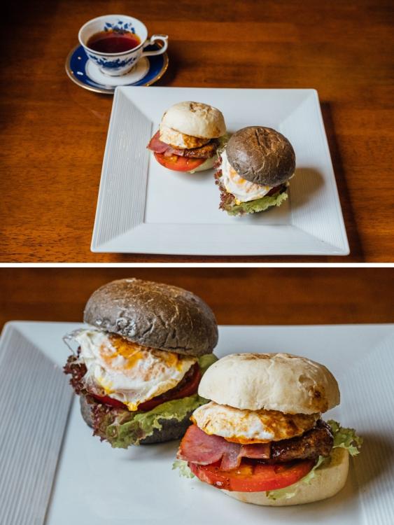 古墳バーガーの特徴は、なんといってもイカ墨を使った真っ黒なバンズです。筑豊地域の炭鉱で栄えた歴史も表現した、他では味わえない独自の味わいです。そして白のバンズは米粉が使われています。
