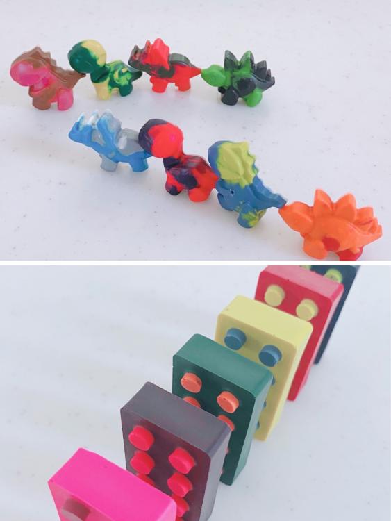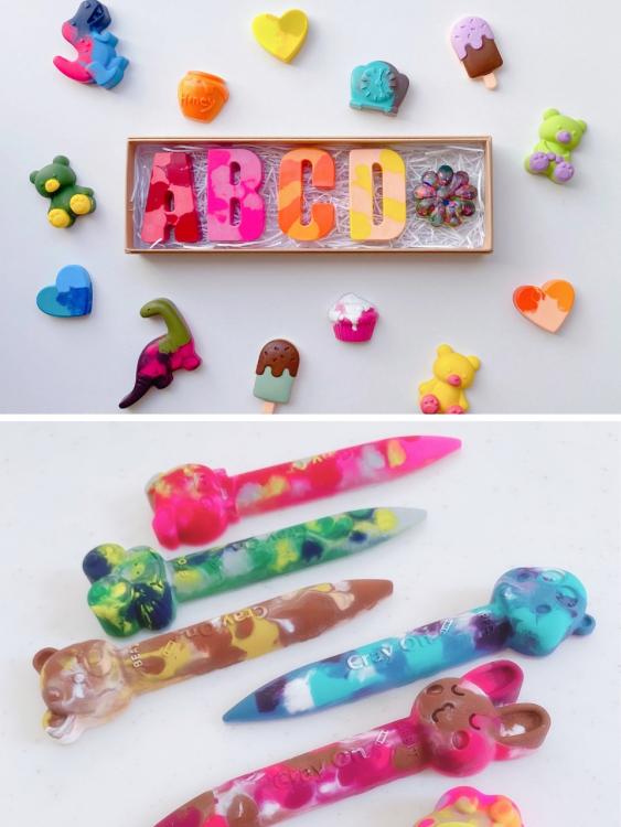 萩原さんが手がけるカスタムクレヨンは、すべてハンドメイドの一点もの。シリコンの型に砕いたクレヨンを詰める製法で、色の組み合わせや模様は無限大です。