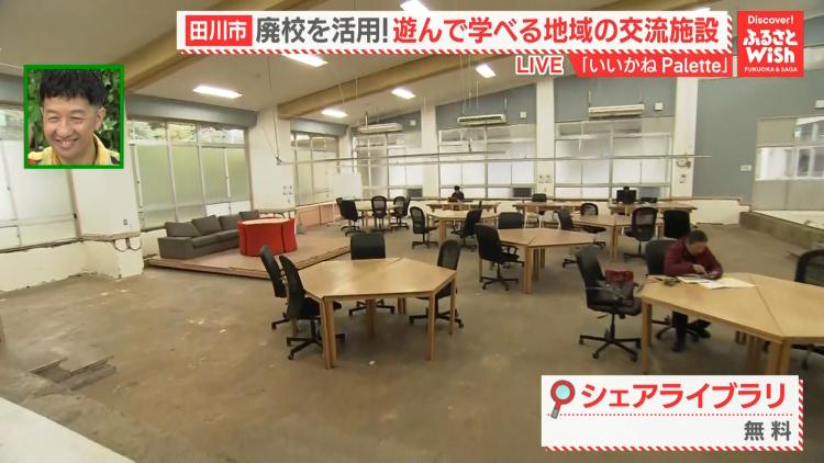 廃校を再活用して生まれた交流施設『いいかねPalette』は「なんでもできる世界をつくる」がコンセプトの遊んで、学んで、泊まれる施設です。田川市民はもちろん、観光客でも誰でも利用可能。元校舎の施設の中には、自由教室、体育館、中庭、シェアライブラリ、エントランス、リラックスルーム、ドミトリー(宿泊)など様々なスペースがあります。