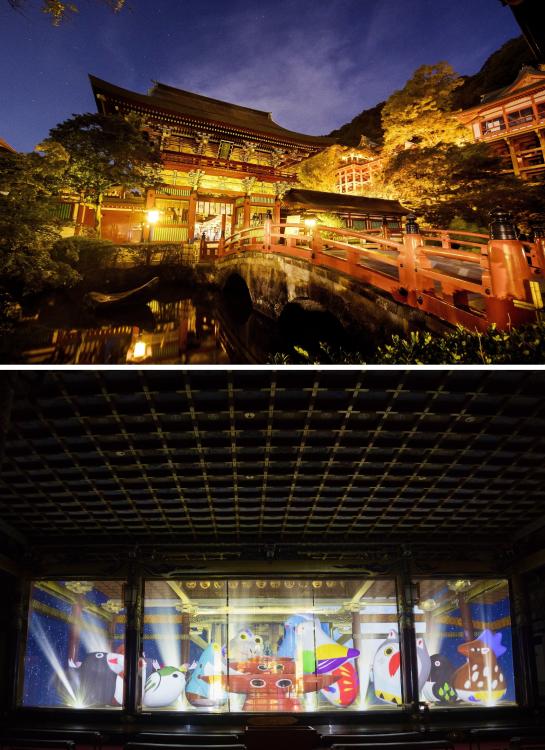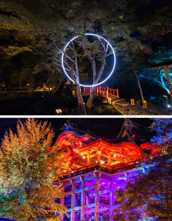 秋の夜、荘厳な境内が幻想的な光と音に包まれます。