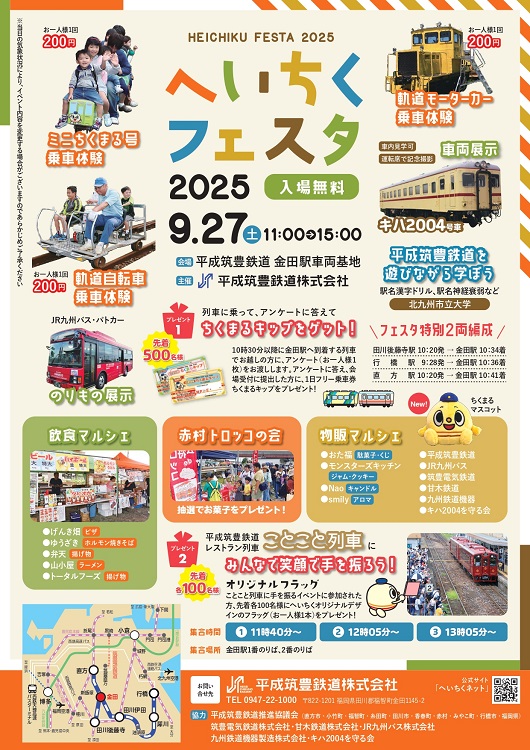 9月27日(土)、平成筑豊鉄道の金田駅と車両基地を舞台に、恒例の『へいちくフェスタ』が開催されます。普段は立ち入ることのできない貴重な場所で、鉄道の魅力を満喫できるイベントです。
